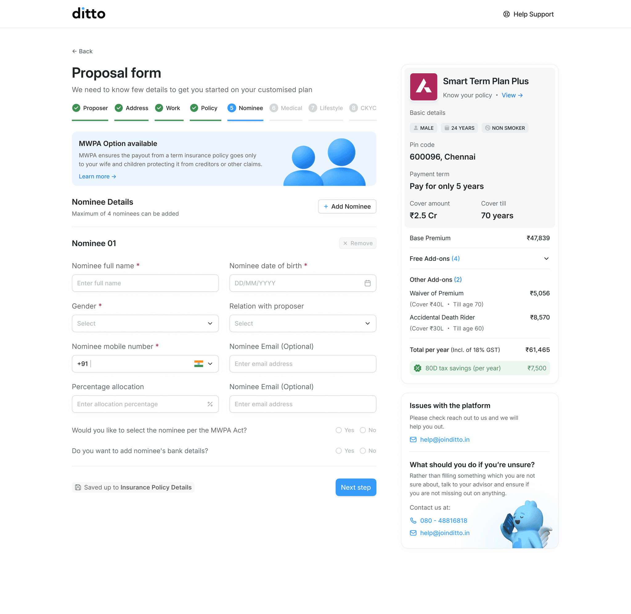 After getting the insurance advice from the Ditto advisor team, the user goes through this separate process purchase journey flow, where they give their information and select policy plans based on their needs.