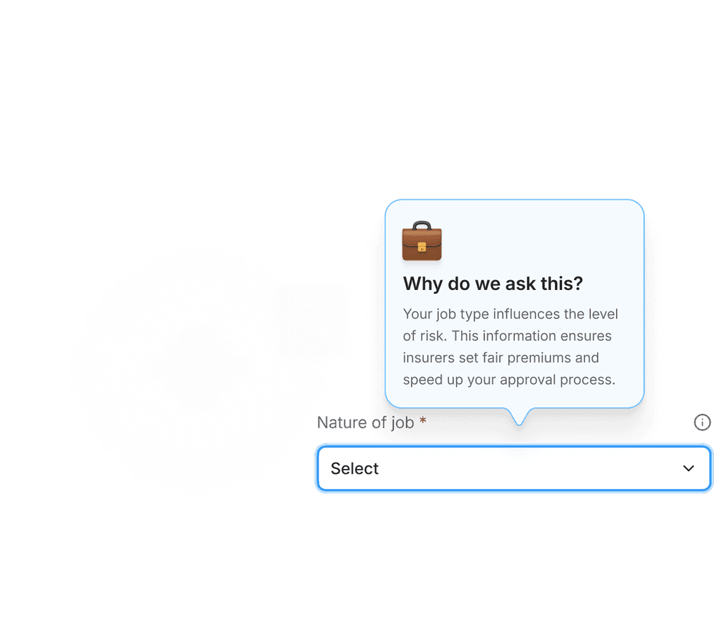 #2. Guidance popover message (Blue color) - Which guides the user to understand the need for the information and how it will affect the policy premium.